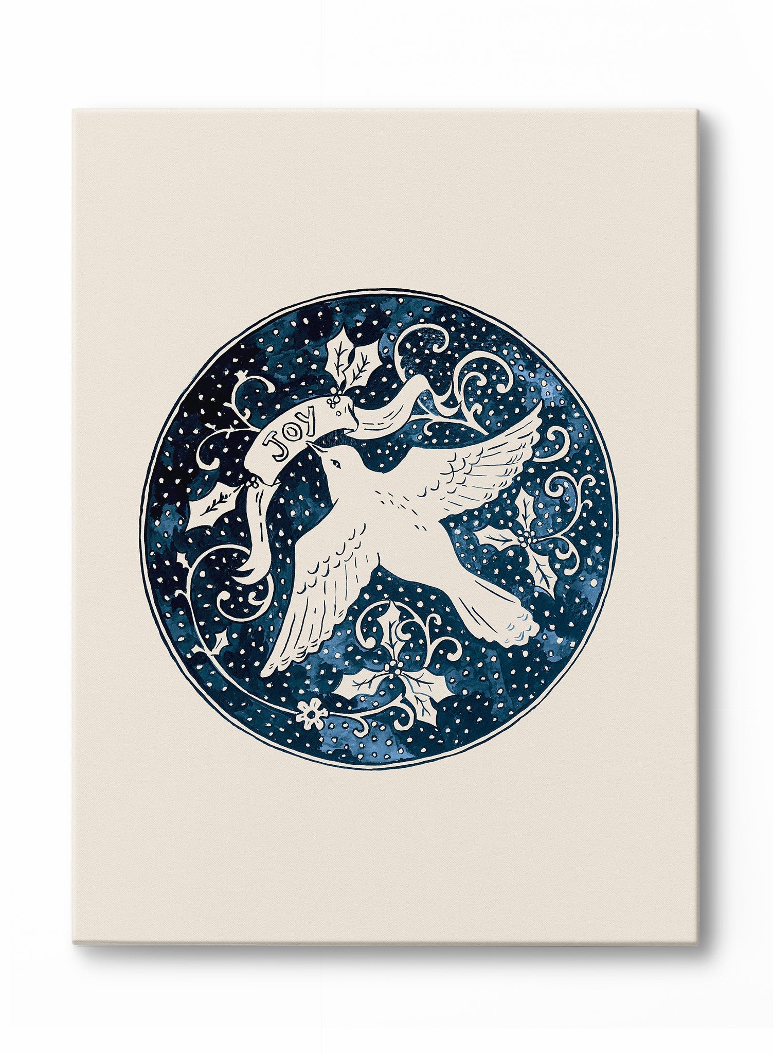 This graceful artwork features a white dove carrying a banner with the word “Joy.” The bird is set against a deep blue circular background filled with swirling vines and holly leaves. Snowflakes fall gently within the scene, adding a sense of winter tranquility to the composition.