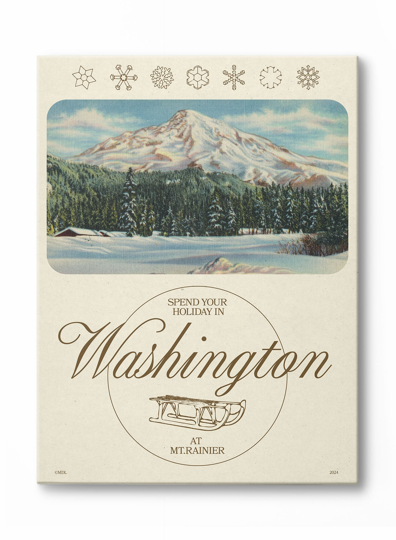 This vintage-style travel poster brings to life the serene beauty of Mt. Rainier. The snow-covered mountain dominates the background, standing proudly among towering evergreen trees. Below the mountains, a snowy cabin nestles into the landscape, while stylized snowflakes line the top of the composition, lending a decorative element.